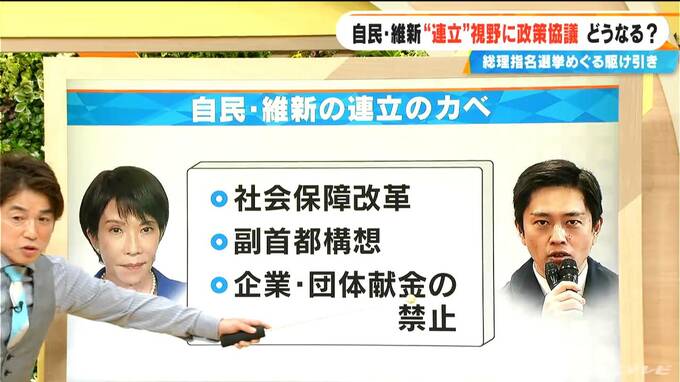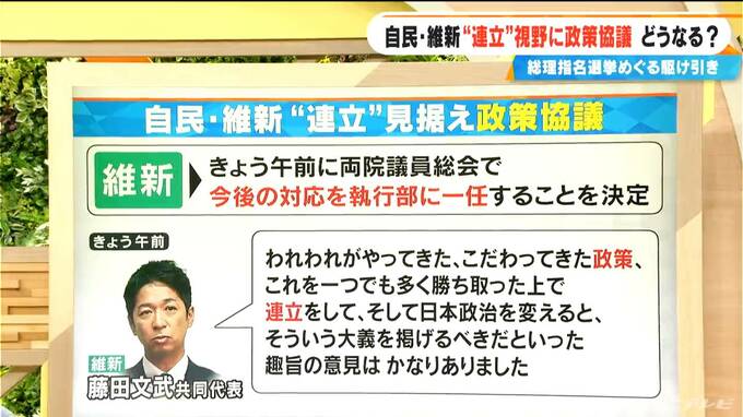 ただ維新としては、きょう午前の両院議員総会で、藤田文武共同代表がこう言っています。「われわれがやってきた、こだわってきた政策、これを一つでも多く勝ち取ったうえで連立をして、そして日本政治を変えると、そういう大義を掲げるべきだといった趣旨の意見はかなりありました」。こだわってきた政策、ここが大事だと言っているんです。