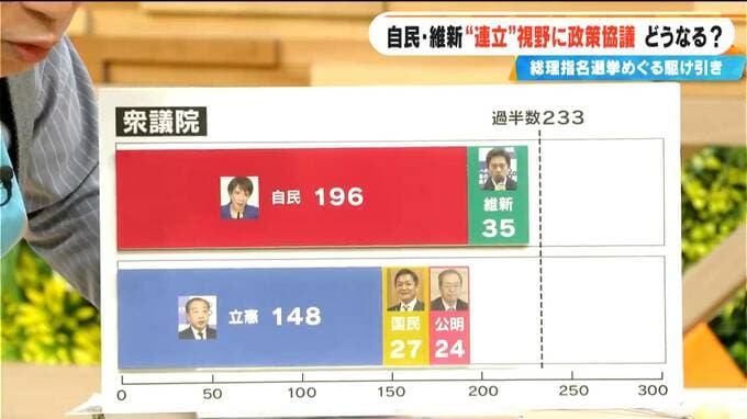 では、この結婚に賛同者はどのくらいいるのか。今、野党中心の話だったんですが、衆議院の数を見てみましょう。自民党は196人、維新は35人でこの2つの党だけで過半数の233人には僅かながら及びませんが231人。総理指名に関してはこれで「高市新総理」誕生が俄然見えてきます。