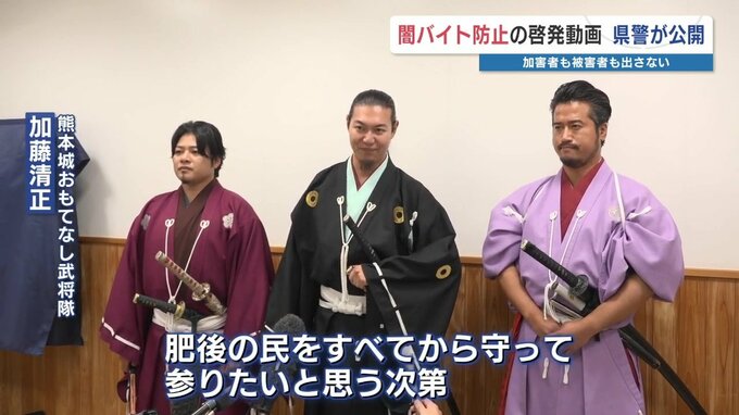 こうしたことから動画では、「熊本城おもてなし武将隊」たちが登場して「高額・即金」などの甘い言葉にだまされないように呼びかけ、そうした勧誘を受けた場合は、相談窓口の#9110に電話することなどを盛り込んでいます。