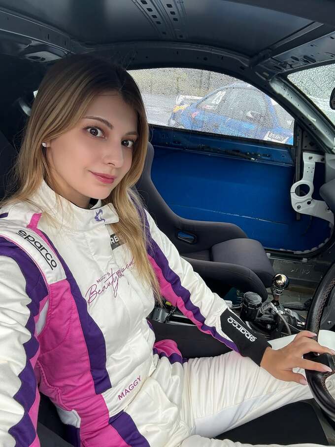 投稿では、白のレーシングスーツに身を包んだマギーさんが、運転席に座る写真とともに「ドリフト特訓しよーっと!」と意気込みを綴っています。