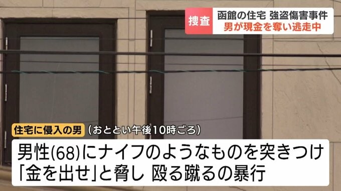 14日午後10時ごろ、函館市神山の住宅で、68歳の男性が帰宅したところ、中にいた男がナイフのようなものを突きつけて「金を出せ」と脅し、男性の顔を殴ったり蹴ったりしました。