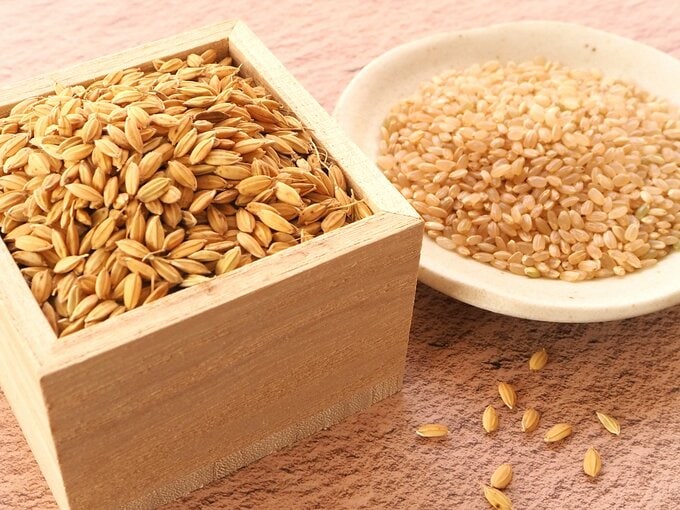 一般的なコイン精米機で精米できるのは、もみがらを取り除いた「玄米」(写真右)のみです。収穫したてのもみがらが付いたままの米(写真左)を精米することはできません。