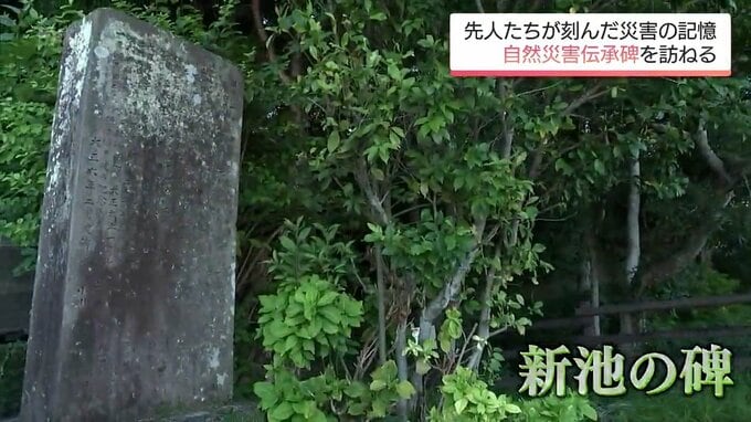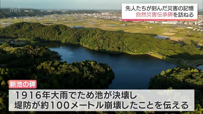 堤防がおよそ100メートルにわたって崩壊したことを伝える 新池の碑