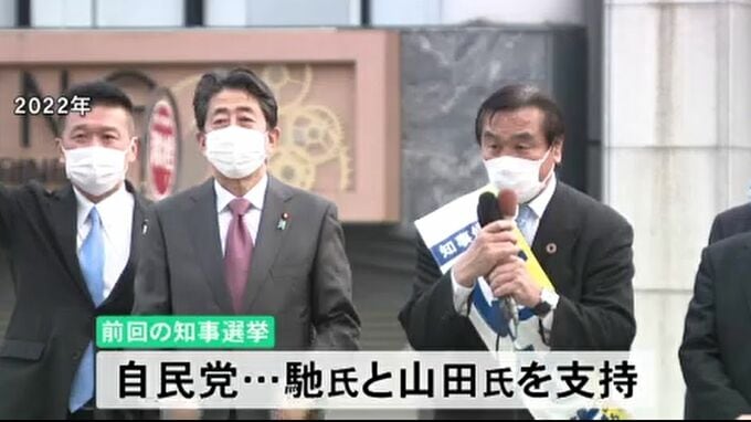 馳氏と山野氏、自民党の元参院議員・山田修路氏が立候補した前回2022年の知事選で、各政党や団体がどの候補を推薦または支持したかを振り返ります。