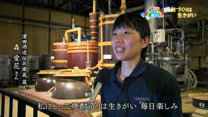 (浜田酒造伝兵衛蔵 蔵人・森愛花さん)「私にとって焼酎造りは生きがい。毎日楽しみ。家でももろみのこと、こうじのことを考えている」