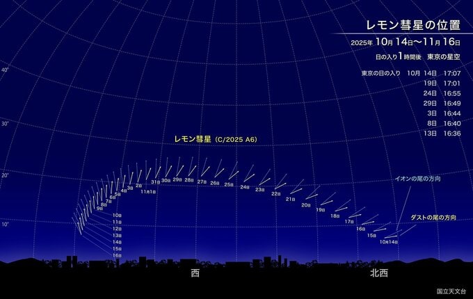 レモン彗星は、10月21日に地球に最も近づき、最も明るく見えるようになるといいます。良く晴れれば、肉眼でも見えるかもしれません。