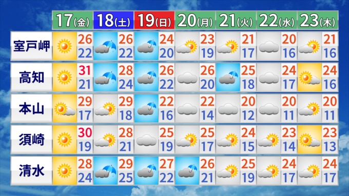 17日の高知県内は、高気圧の影響で広い範囲で秋晴れとなるでしょう。一日を通して雨の降るところはなさそうです。