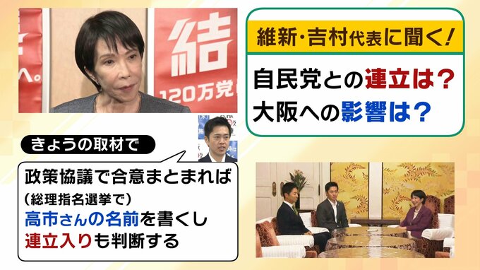 今日の取材で吉村さんは、「政策協議で合意がまとまれば、総理指名選挙で高市さんの名前を書くし、連立入りも判断する」と答えています。実際、連立の現実性というところは今の段階ではどう捉えていますか。