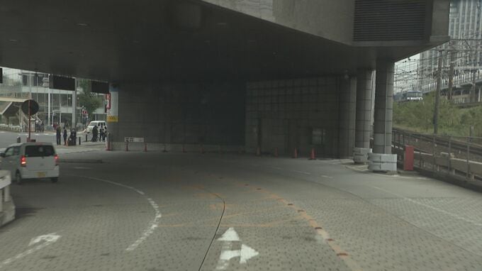 「事故があった駐車場から地上に繋がるスロープです。事故を起こした車は、このスロープを下りきった先で反対車線にはみ出して横断歩道を渡っていた人たちをはねたとみられます」