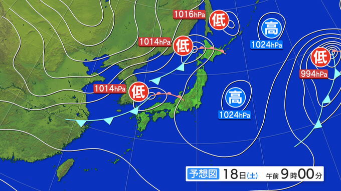 18日(土)から19日(日)にかけて低気圧が発達しながら、日本を通過する見込みです。全国的に雨が降り、気象庁の見解では「18日(土)~19日(日)にかけて、東日本日本海側は、前線の影響で大雨となり、前線の活動の程度によっては警報級の大雨となるおそれがある」としています。