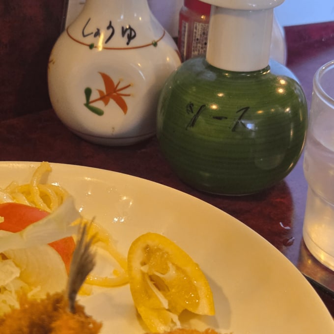 ソースとしょうゆが、同じデザインの容器(背の高さは違う)に入っている。豪華なものからプラスチック製のものまでいろいろなデザインがあった。