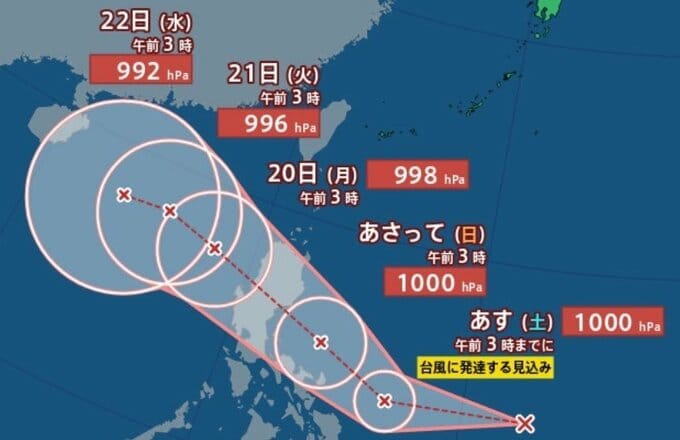 フィリピンの東で熱帯低気圧が発生し、あす(18日)午前3時までに台風に発達する見込みです。