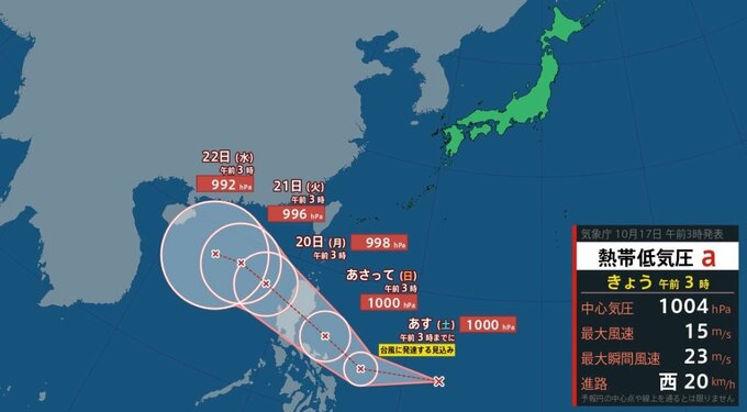 気象庁によりますと、17日午前3時、熱帯低気圧はフィリピンの東の海上に位置しており、西へ時速20kmで進んでいます。中心気圧は1004hPa、中心付近の最大風速は15m/s、最大瞬間風速は23m/sとなっています。