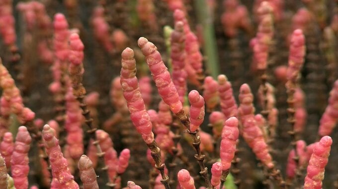 環境省の絶滅危惧II類に指定されているアッケシソウが、本州で唯一の自生地とされる岡山県浅口市で紅葉のシーズンを迎えています。その色と形から「サンゴソウ」とも呼ばれる「アッケシソウ」です。