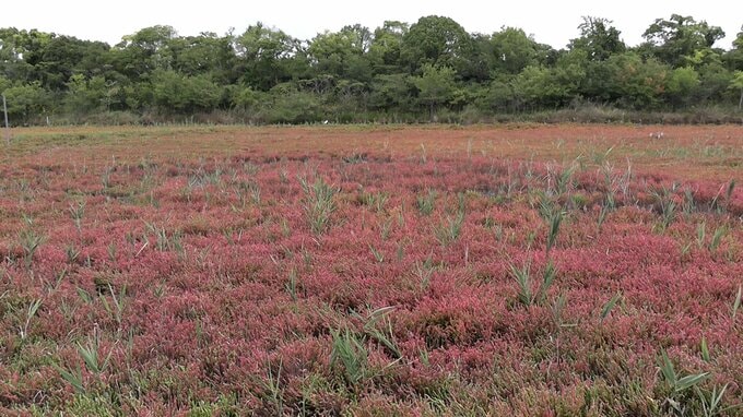 浅口市寄島町の自生地で、色づき始め、地元の「守る会」が紅葉を宣言しました。海水が流れ込む湿地で育つ「アッケシソウ」は本州では浅口市が唯一の自生地とされています。開花や色付きは平年より1週間ほど遅かったものの海辺に訪れた秋を彩っています。