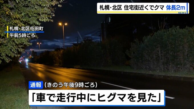 16日夜、札幌市北区屯田町の住宅街の近くで、体長2メートルほどのクマが目撃されました。 16日午後9時ごろ、札幌市北区屯田町の道道128号で、帰宅中の男性から「車で走行中にヒグマを見た」と110番通報がありまし…