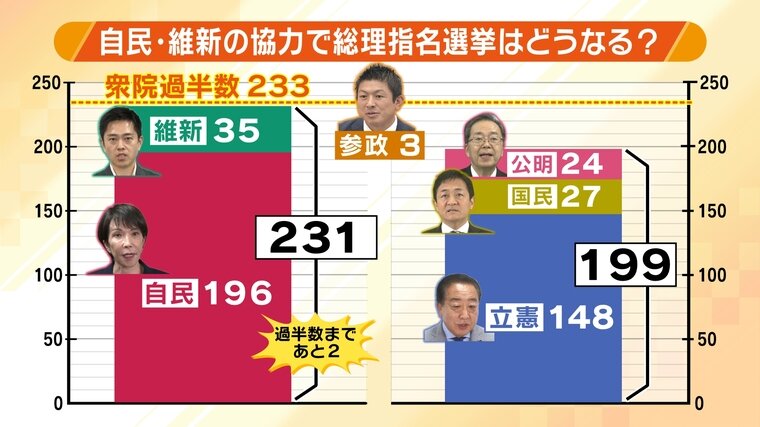 (大八木解説委員)「自民党からすると何とか過半数ラインを超えて、1回で高市氏が総理に指名されるところに持っていきたい。そこに維新が乗ってきて、今のところの流れでいうと、協議がまとまれば首班指名で高市氏と書くことや、その先の連立も濃厚ではないかと思います。高市氏は参政党の神谷代表と16日の午後にも面会していて、衆院過半数をめぐる攻防になっています」