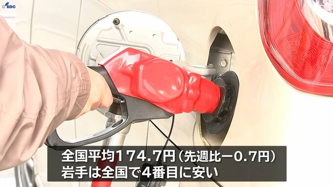 全国平均は先週より0.7円下がった174.7円で、都道府県別で岩手は愛知、埼玉、宮城に次いで4番目に安い価格でした。