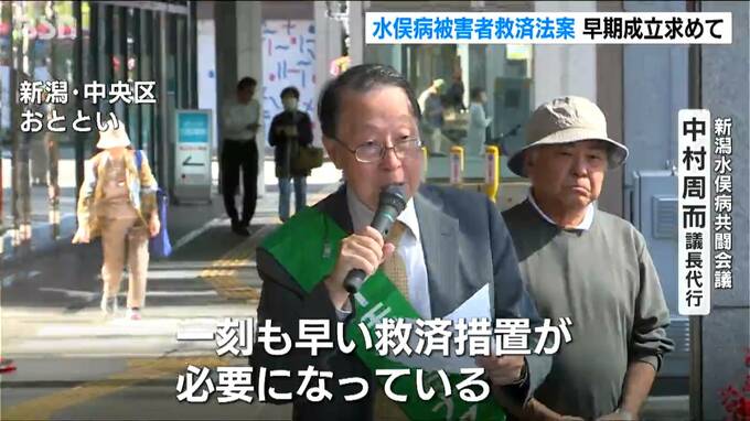 水俣病の被害者救済を目指す法案の早期成立を求めて、被害者団体などが新潟市で署名を呼びかけました。