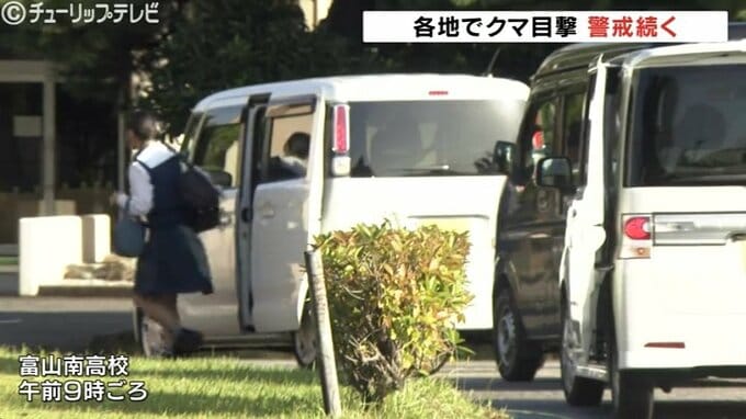 クマが出没した現場からおよそ600メートル離れた富山南高校では、保護者の送迎のもと登校する生徒が多くみられました。