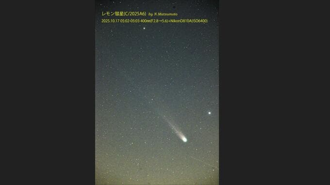 記事の写真は長崎県天文協会の松本直弥さんが、17日午前5時頃捉えた「レモン彗星」です。