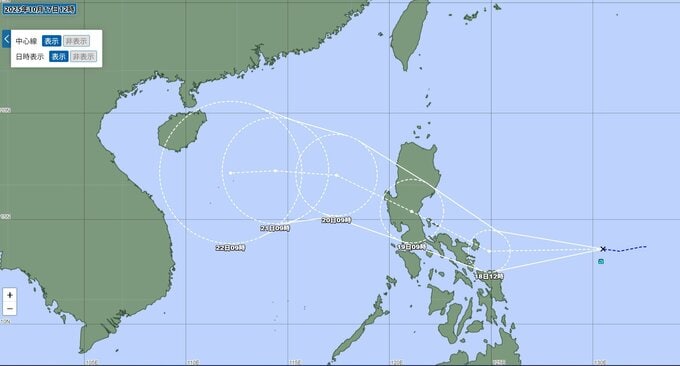 台風の予報進路は、予報の期間が長くなるほど誤差の幅(予報円)が大きくなります。最新の情報を確認するようにしてください。