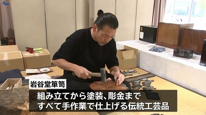 岩谷堂箪笥は、組み立てから塗装、彫金まですべて手作業で仕上げる伝統工芸品です。