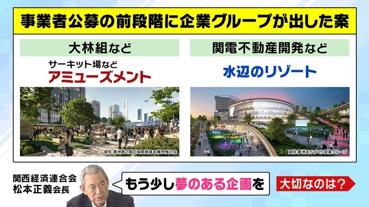 サーキット場については、関西の財界トップである関西経済連合会・松本正義会長が「もう少し夢のある企画にならないのか」と今年7月の記者会見の中で言及。跡地活用の前提として万博の思いを後世に残すものがいいのではないかと考えると、サーキット場は万博とつながるのか?と問題提起したのです。
