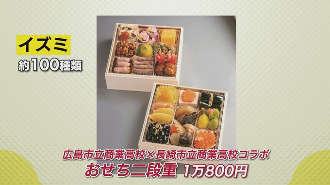 イズミでは、1万円から8万円のものをおよそ100種類扱っています。注目は、去年に続いて広島修道大学とコラボした洋風のものも取り入れた若者向けのおせち3段重ね。