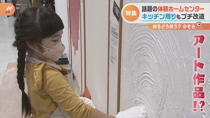 小学1年生の女の子が体験したのは、手で塗ることができる漆喰風の塗料。自由な発想の子どもにかかれば、まるでアート作品のような仕上がりとなりました。