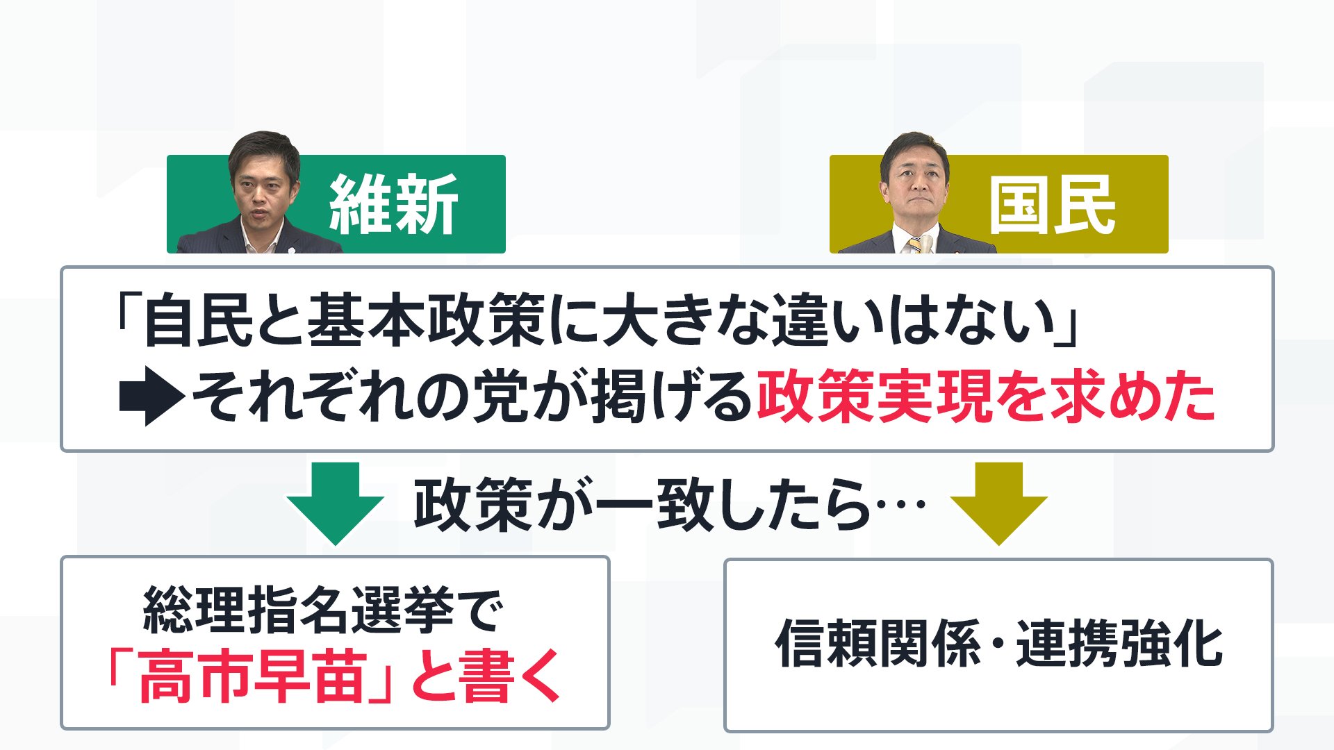 玉木代表は「信頼関係、連携強化」と留める一方、吉村代表は政策合意すれば総理指名選挙で高市氏の名前を書くと明言。