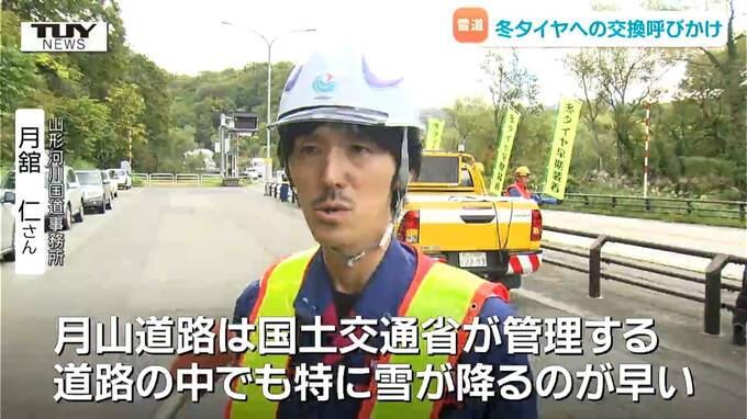 山形河川国道事務所 月舘仁 さん「月山道路は国土交通省が管理する道路の中でも特に雪が降るのが早くて、11月ぐらいが夏タイヤと冬タイヤが混ざるので事故が多くて注意するべき時期。早めにタイヤ交換をしてもらって事故のないように。車間距離も取って運転してもらえればありがたい」