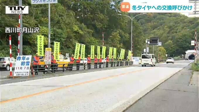 山形県西川町ではきょう、早めの冬タイヤ装着を呼びかける啓発活動が行われました。