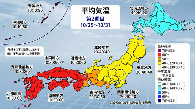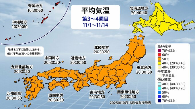 11月に入ると、朝の最低気温は北日本は0℃くらい、東日本・西日本の山沿いや内陸部も10℃くらいまで気温が下がる日が出てくる見込みです。