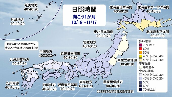 日照時間は「平年並か少ない」所が多く、例年に比べると秋晴れの日は少ない見込みです。