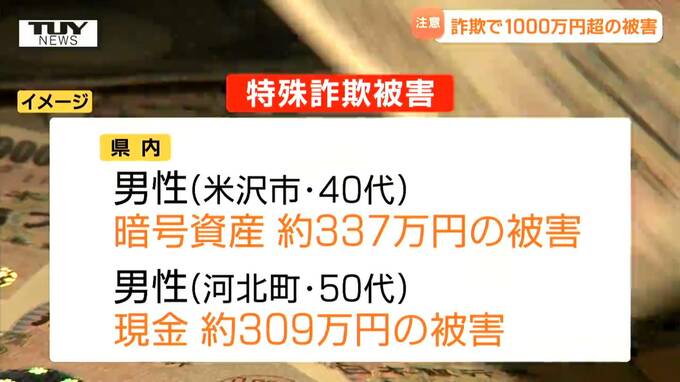 県内ではこのほかにも米沢市の40代男性が暗号資産およそ337万円をだましとられたほか、河北町の50代男性が現金およそ309万円をだまし取られる被害が確認されています。
