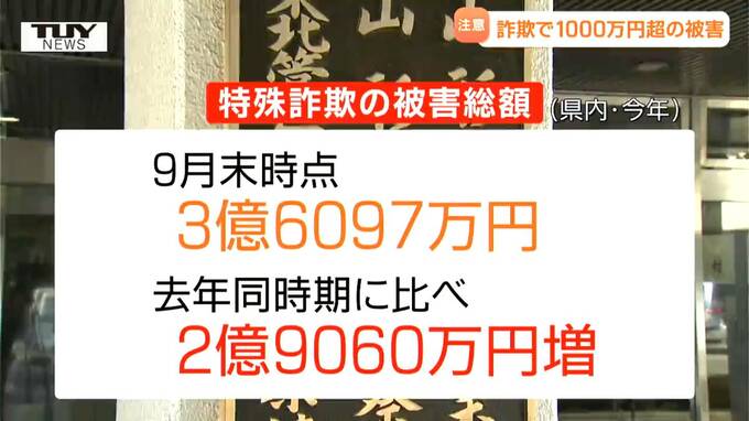 県内で今年確認された特殊詐欺の被害総額は、9月末時点で3億6097万円にのぼり、去年の同じ時期に比べて2億9060万円増えています。