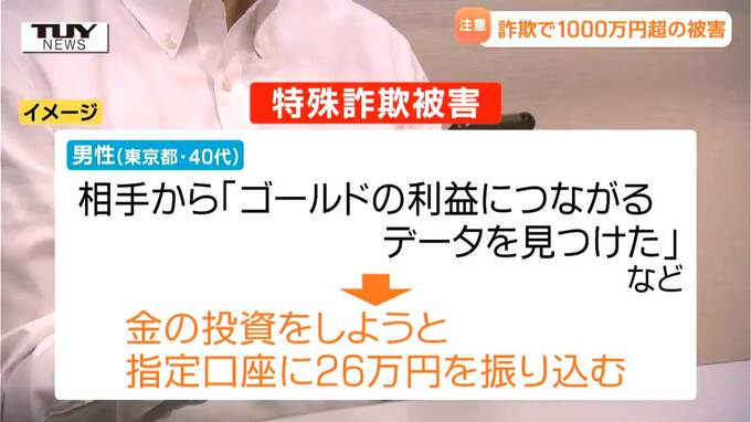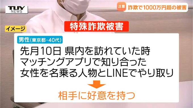 仕事で山形県内を訪れていた東京都の40代男性が、マッチングアプリで知り合った女性から金の投資名目で現金と暗号資産あわせて1000万円以上をだましとられる詐欺被害にあいました。