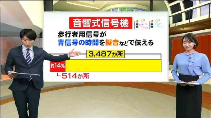 宮城県警によりますと、宮城県内3487か所に信号機が設置されていてそのうち、514か所が音響式信号機です。「ピヨピヨ」や「カッコー」などと音が鳴ります。こうしてみると少なく感じますが、仙台駅前など街の中心部に集中しています。