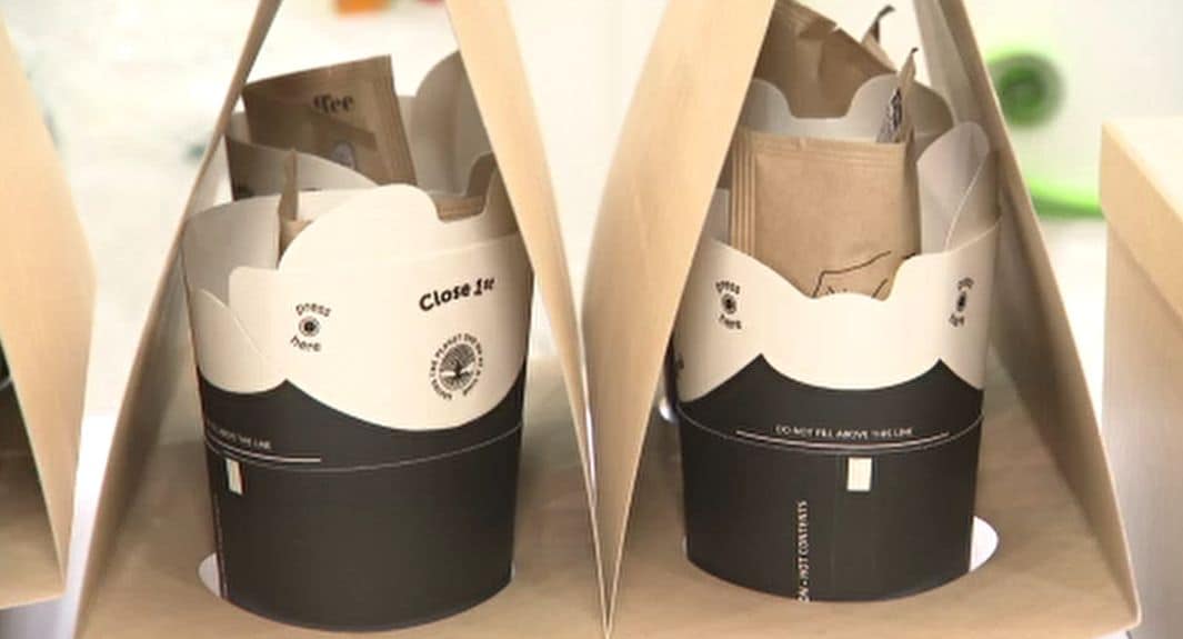 「地産地消の紙」のコーナーでは、古紙でつくった飲み物を運ぶための手提げケースなど、アイデア豊かな製品が紹介されています。