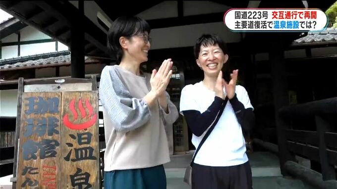 片側交互通行に切り替わり、2か月ぶりの通行再開です。道路沿いの温泉施設では思わず…。
