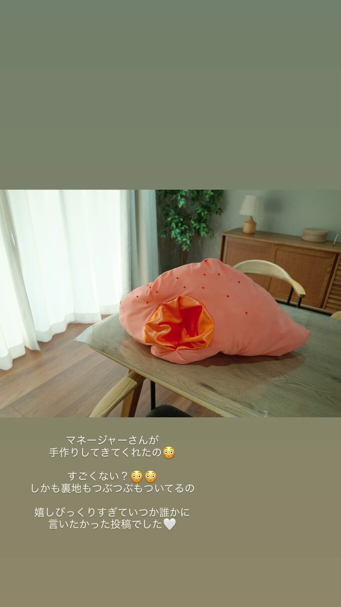 続く投稿で「マネージャーさんが手作りしてきてくれたの」「すごくない?」とテキスト。テーブルの上には、濃いピンク色の大きな布袋のようなものが置かれていて、入り口の内側はシルクのような光沢があり、表面には赤いツブツブが着けられています。
