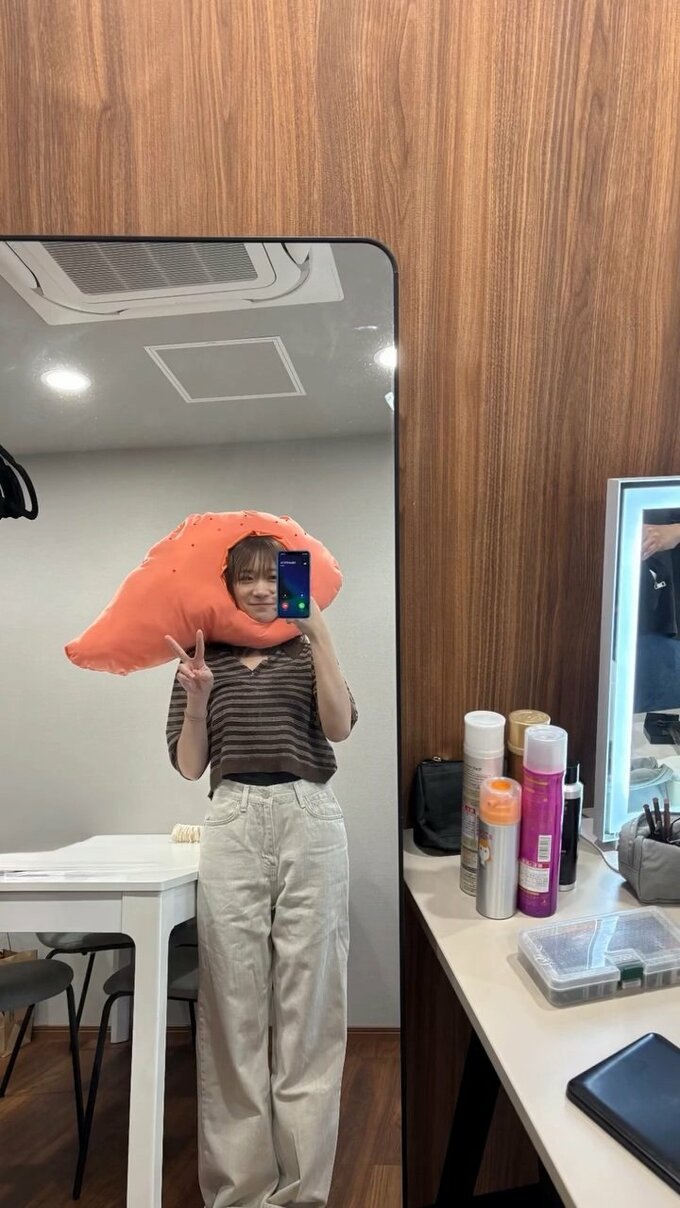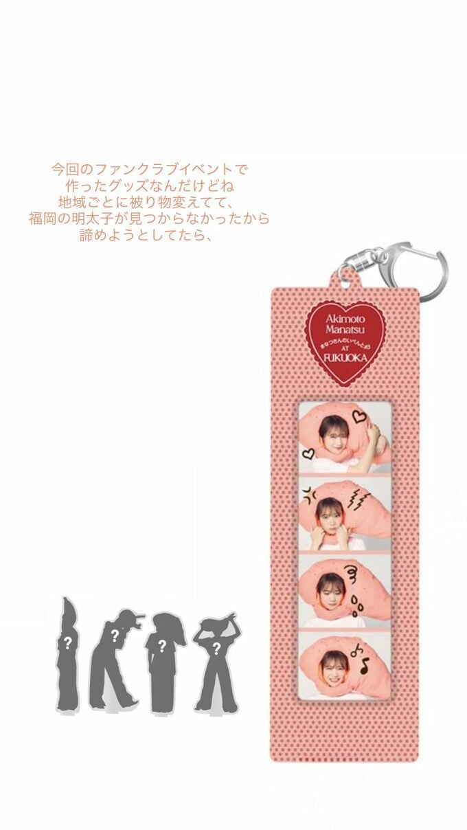 秋元さんはその投稿に「今回のファンイベントで作ったグッズなんだけどね」「地域ごとに被り物変えてて」「福岡の明太子が見つからなかったから諦めようとしてたら」とテキストで綴っています。