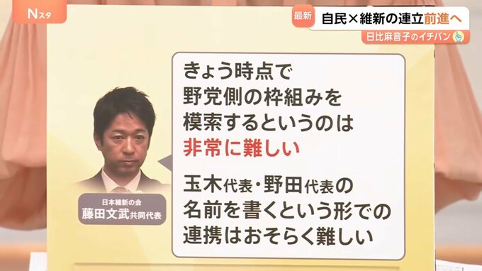 17日、自民と維新の政策協議が行われましたが、連立の行方はどうなっていくのでしょうか。そして、日本維新の会の藤田共同代表の会見が行われましたが、「大きく前進した」という表現があったものの、「大筋合意」という表現は避けた形になります。