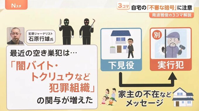犯罪ジャーナリストの石原氏は、最近の空き巣犯の特徴について「闇バイト・トクリュウなど犯罪組織」の関与が増えたと指摘しています。