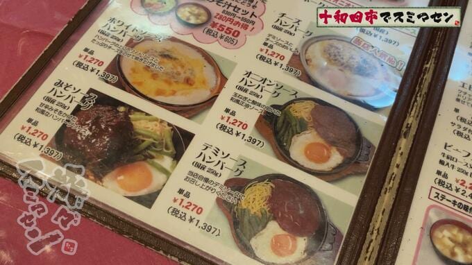 メニュー表には、オニオンソースハンバーグ、ホワイトソースハンバーグなどカラフルなサンプル写真がたくさん載っています。