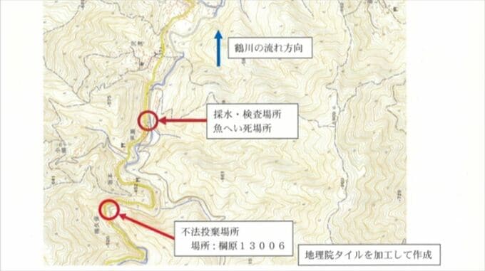原因とされるペンキ約100リットルは棡原の崖地に不法投棄され、地形の関係から回収が困難な状態となっています。