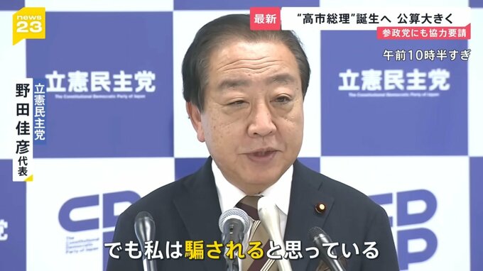 「私はかつて『議員定数削減』を条件に安倍元総理との党首討論で、衆議院を解散した経験がある。その経験から言うと、自民党はのむかもしれない。でも、私は騙されると思っている」