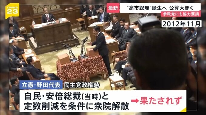 民主党政権時代の2012年、自民党・安倍氏と定数削減を条件に衆議院の解散をしたものの、その約束は果たされませんでした。