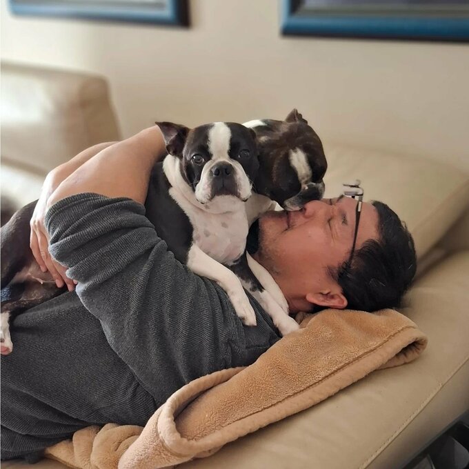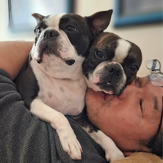 貴乃花さんは、ソファーで仰向けになって横になっているところに、ボストンテリアの愛犬姉弟2匹が並んで、胸の上に乗っかっている画像を投稿。1匹はさらに、貴乃花さんの顔を舐めているようです。